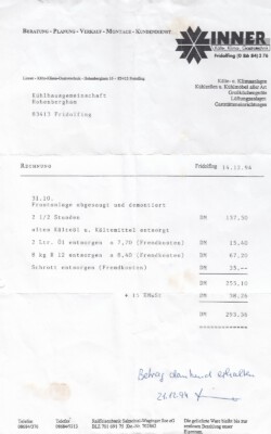 Das Kühlhaus wurde dennoch genutzt bis ins Jahr 1994, bis am 2. oder 3. Mai 1994 plötzlich die Kühlanlage seinen Dienst versagte. Engültig abgebaut wurde die Anlage dann im Dezember 1994 von Firma Linner, siehe auch nebenstehende Rechnung über die Entsorgung und Verschrottung.
