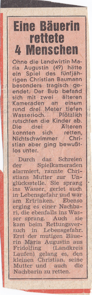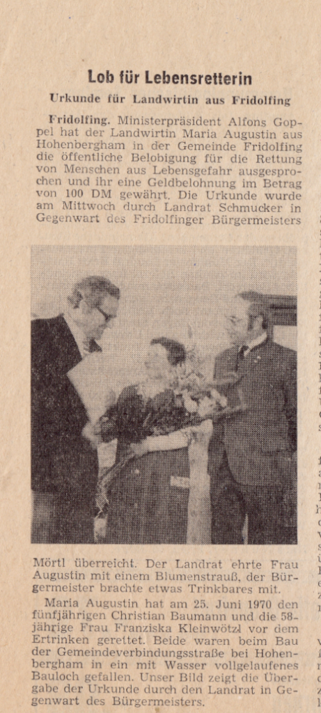 Die Landwirtin Maria Augustin – bekannt als Weber Marie – aus Hohenbergham (Gemeinde Fridolfing) griff im entscheidenden Moment ein: Sie zog den Buben und die in Not geratene Helferin aus der Baugrube. Christian konnte anschließend wiederbelebt werden; ein herbeigerufener Arzt übernahm die weitere Versorgung. Die drei Zeitungsausschnitte dokumentieren sowohl den dramatischen Rettungseinsatz (25. Juni 1970) als auch die spätere öffentliche Anerkennung: Maria Augustin erhielt eine Urkunde und eine Geldbelohnung (100 DM), ausgesprochen durch Ministerpräsident Alfons Goppel und überreicht durch Landrat Leonhard Schmucker im Beisein des Bürgermeisters Josef Mörtl (Traunsteiner Wochenblatt, 26. Januar 1973).